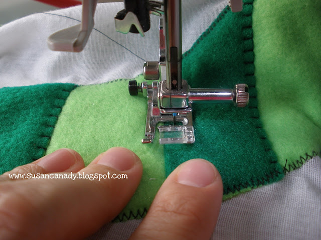 Next we need to sew down the strips.  I hadn't thought through this before I actually got to this step.  For a very brief moment I thought I would just leave them sewn down with the zigzag on the sides and not sew down the top and bottom.  And then I remembered I was making this for a 2 year old.  Not sewing down any and all strips would be completely and utterly stupid if I want this blanket to last longer than one night.  So then I had to decide how to do it.  At first I was trying to figure out a way to do it so you wouldn't see the stitching, but the felt wasn't thick enough to do an invisible stitch, so in the end I just picked a stitch I liked and sucked it up.  The funny thing is, I ended up REALLY liking it this way!  I used the blanket stitch and sewed the vertical line perfectly lined up with the felt so you can't see it and all you can see are the little horizontal lines.  So whatever stitch you use, make sure you love it because you will be sewing down the top and bottom of EVERY dark green strip!